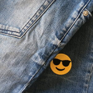 Tässä on pyöreä kiinnisilitettävä kangasmerkki, jossa on Hymiö, jolla on aurinkolasit. Merkin koko on noin 4 cm, ja sen taustapuolella on Iron-On-liimapinta, joka tarkoittaa, että merkin voi silittää kiinni vaatteisiin tai muihin kankaisiin. Tämä merkki sopii mainiosti vaatteiden paikkaamiseen tai uudistamiseen, ja se voi myös toimia hauskana somisteena esimerkiksi puseroissa tai kangaslaukuissa.
