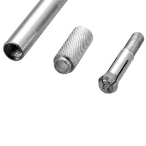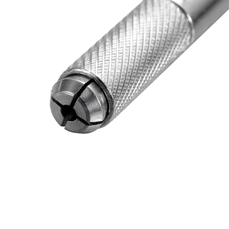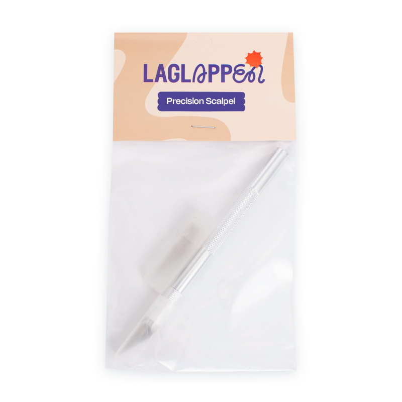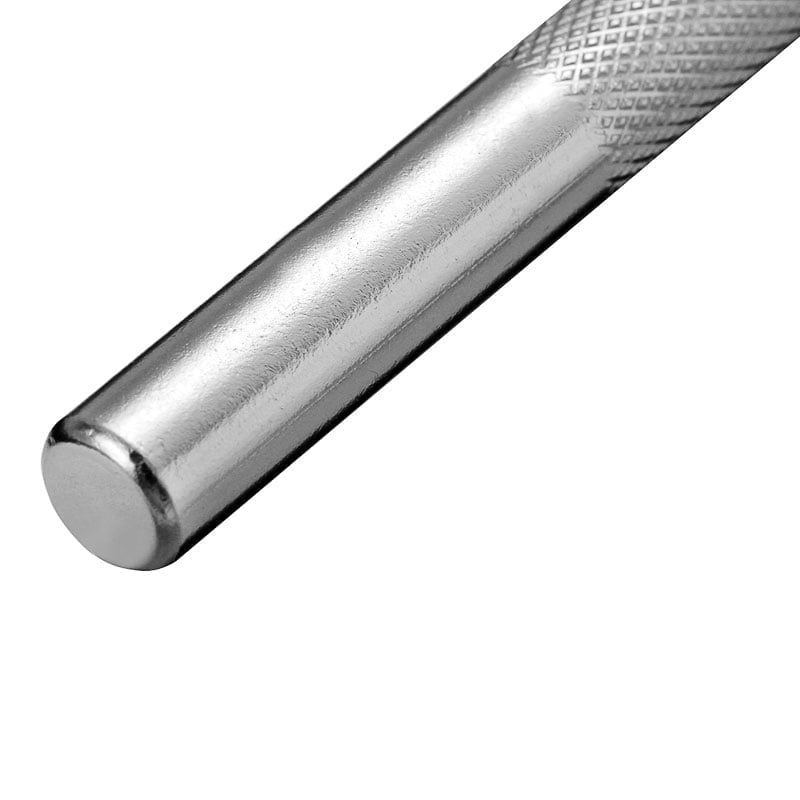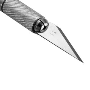 Metallinen kirurginveitsi, jossa on nystyräinen kahva turvallisen otteen takaamiseksi. Toimitus sisältää yhteensä 6 terää, jotka toimitetaan käytännöllisessä ja kestävässä säiliössä.