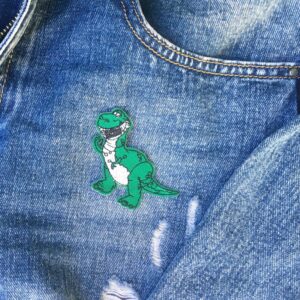 Leikkidinosaurus -kangasmerkki on kiinnisilitettävä kangasmerkki, jossa on taustapuolella Iron-On-liimapinta. Merkin koko on noin 7 x 5,8 cm ja se on väriltään vihreä. Se sopii hyvin koristeeksi vaatteisiin tai muihin kankaisiin, kuten puseroihin, housuihin, laukkuihin tai lippalakkeihin. Merkki voi myös toimia hauskana paikkalappuna. Aiheena on hauska dinosaurus ja sen väri on pirteä vihreä. Pakkaus sisältää silitysoppaan, joka helpottaa merkin kiinnittämistä.