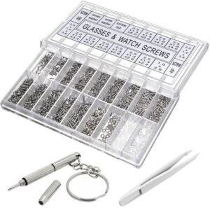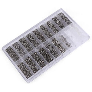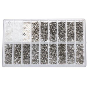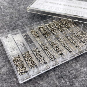 Jos haluat korjata kellon tai löytää oikean ruuvin silmälaseihisi, tämä tarvikelaatikko on sinua varten. Laatikosta löydät paljon erikokoisia ruuvin aluslevyjä, muttereita ja ruuveja. Vaihtoehtojen lukumäärän ansiosta sinun pitäisi löytää oikea osa tarpeisiisi. Ruuvit sopivat niin tavallisiin silmälaseihin kuin aurinkolaseihinkin, mutta niitä voidaan käyttää myös muissa elektronisissa laitteissa, kuten leluissa ja kelloissa. Silmälasiruuvimeisseli ja pinsetit sisältyvät toimitukseen.